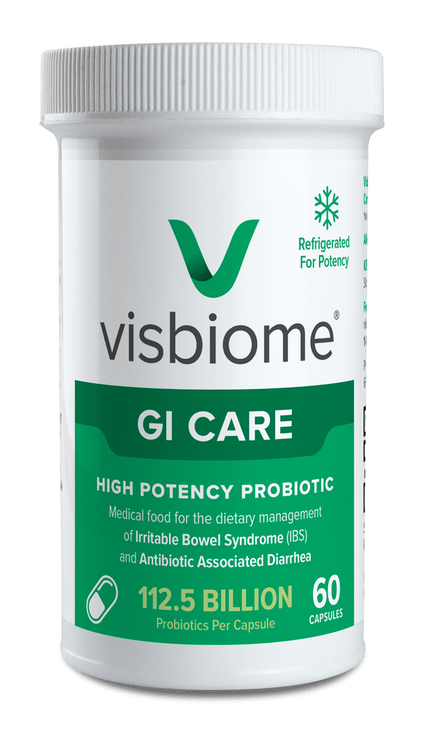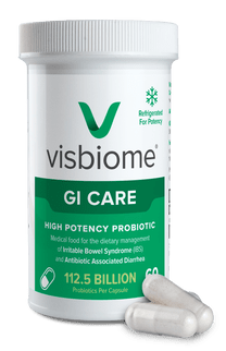 Visbiome GI Care is a high potency probiotic designed for the dietary management of dysbiosis, with proven support for those experiencing Irritable Bowel Syndrome (IBS) and Antibiotic-Associated Diarrhoea (AAD). Each capsule provides 112.5 billion CFUs, making Visbiome probiotic a very concentrated and potent probiotic blend.