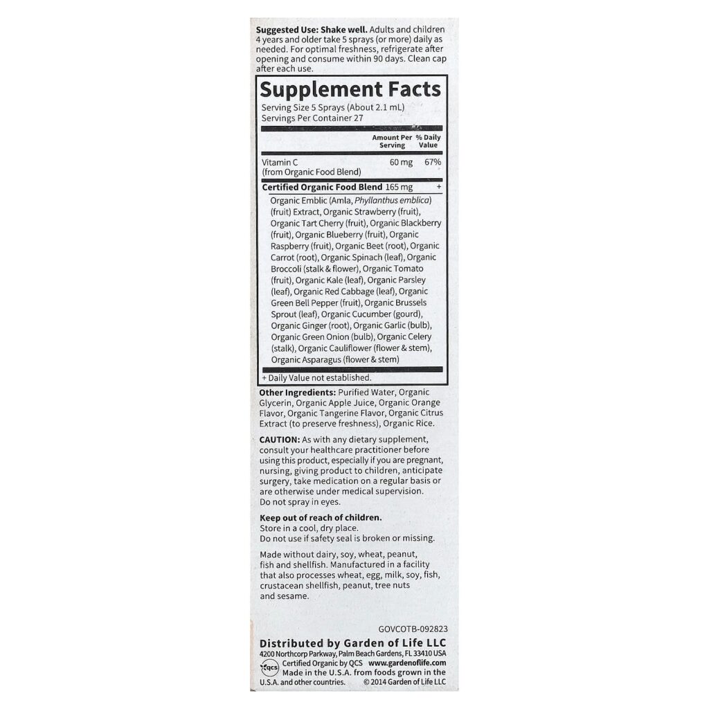 The Garden of Life Organics Vitamin C Organic Spray in Orange-Tangerine flavor is an easy and tasty way to support immune health and overall wellness. Made from organic amla (emblic) berries, it provides a natural source of vitamin C along with bioflavonoids and other co-nutrients that help your body absorb and use vitamin C effectively. This liquid whole-food supplement is USDA Organic, Non-GMO, gluten-free, and free from soy, dairy, peanuts, and shellfish, making it suitable for a wide range of dietary needs. Simply shake well and spray five times daily for adults or children over four to deliver a convenient 60 mg dose of vitamin C from organic fruits and vegetables. For optimal freshness, store in the refrigerator after opening and use within 90 days.