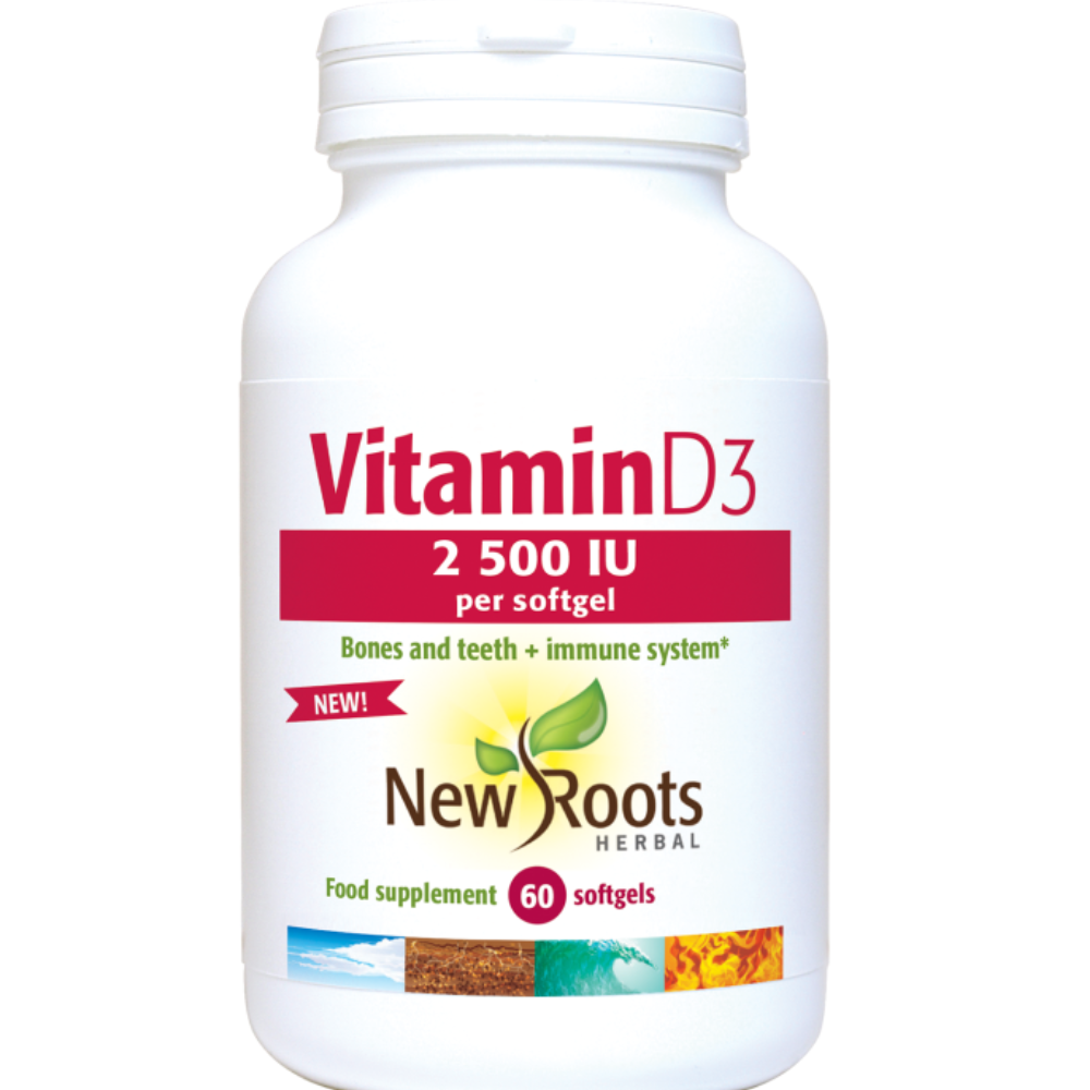 New Roots Herbal Vitamin D3 delivers Vitamin D3 (cholecalciferol) at a strength of 62.5 mcg (2,500 IU) per softgel.