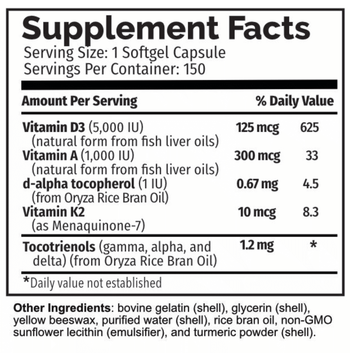 Bovine gelatin (shell), Glycerin (shell), Yellow beeswax, Purified water (shell), Rice bran oil, Non-GMO sunflower lecithin (emulsifier), Turmeric powder (shell)