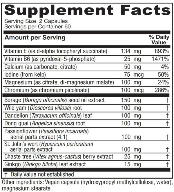 This formula features key ingredients like Vitamin E, B6, Magnesium and Calcium to support symptom relief, along with Chaste tree berry for menstrual balance. It also includes Ginkgo, St. John’s wort, Dong quai, Wild yam, Passionflower and Borage seed oil (rich in GLA) for hormone support and overall menstrual cycle health
