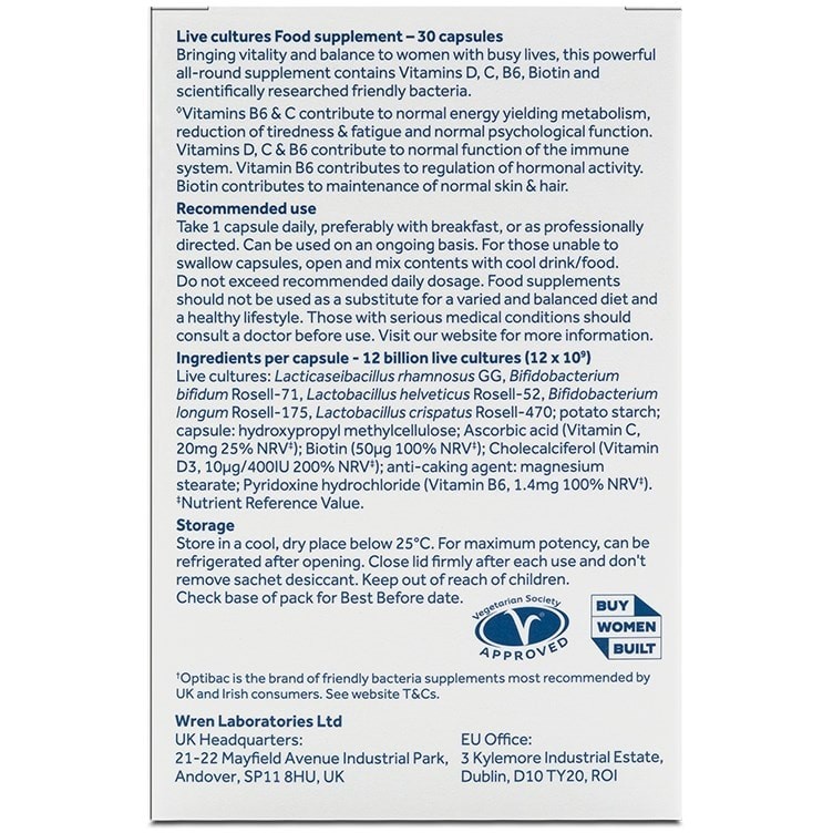 Live cultures: Lactobacillus rhamnosus GG, Bifidobacterium bifidum Rosell-71, Lactobacillus helveticus Rosell-52, Bifidobacterium longum Rosell-175, Lactobacillus crispatus Rosell-470; potato starch; capsule: hydroxypropyl methylcellulose; Ascorbic acid (vitamin C, 20mg/25% NRV‡); Biotin (50μg/100% NRV‡); Cholecalciferol (Vitamin D3, 10μg/400IU/200% NRV‡); anti-caking agent: magnesium stearate; Pyridoxine hydrochloride (Vitamin B6, 1.4mg/100% NRV‡). ‡Nutrient Reference Value.